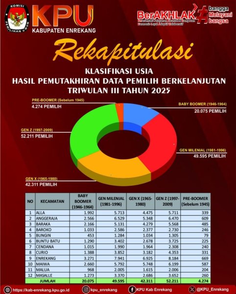 kab-enrekang.kpu.go.id -- Komisi Pemilihan Umum (KPU) Kabupaten Enrekang kembali merilis hasil Pemutakhiran Data Pemilih Berkelanjutan (PDPB) Triwulan III Tahun 2025. Data terbaru menunjukkan bahwa Generasi Z (kelahiran 1997–2009) masih menjadi kelompok pemilih terbesar di Kabupaten Enrekang, dengan jumlah mencapai 52.211 orang.