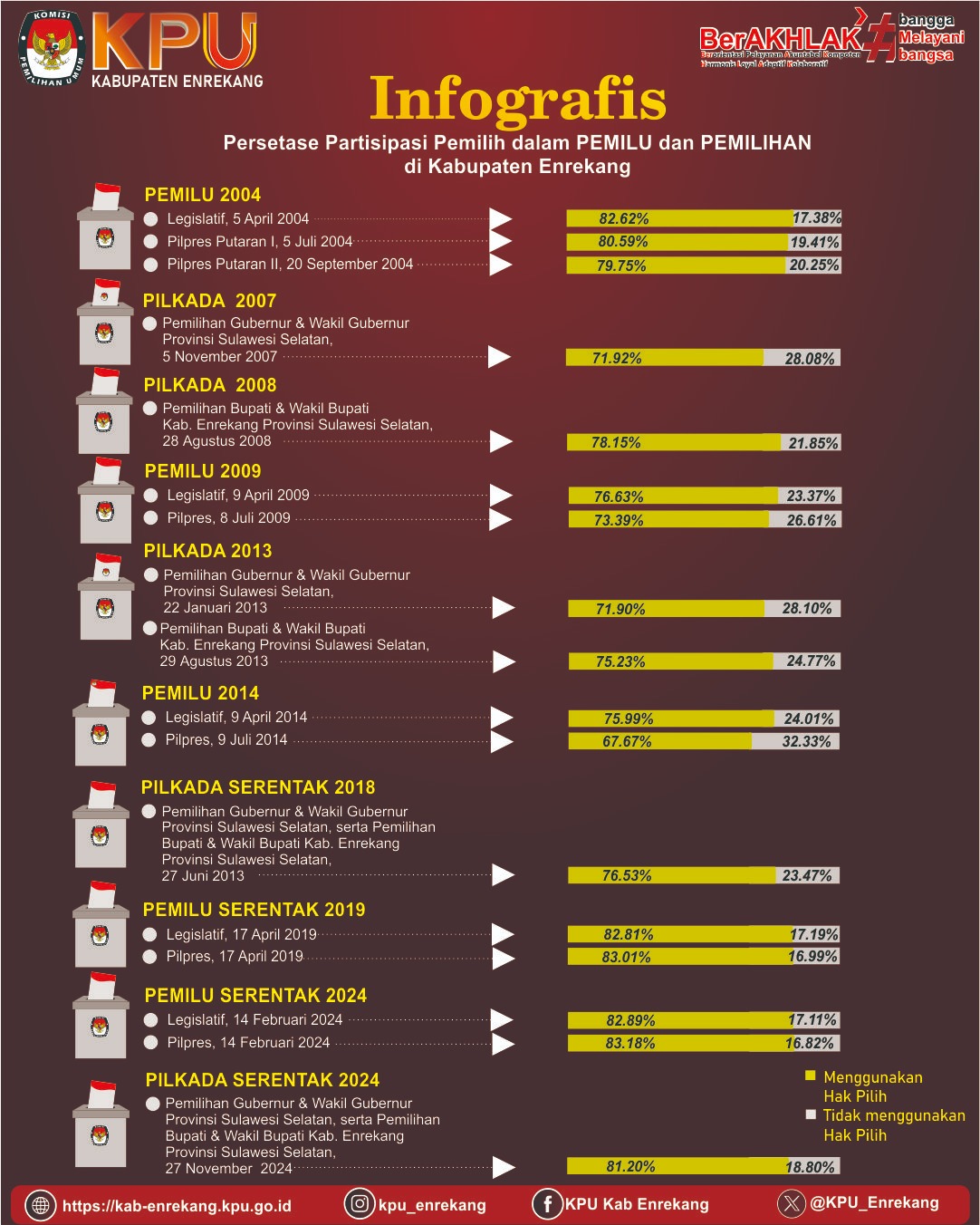 Partisipasi tertinggi dalam Pilkada terjadi pada Pilkada Enrekang tahun 2008, dengan 78,15% pemilih hadir di TPS. Namun, dalam Pilkada Serentak 2024, yang mencakup pemilihan gubernur dan bupati sekaligus, partisipasi tercatat 81,20%, angka yang cukup signifikan dan memperlihatkan antusiasme masyarakat dalam memilih pemimpinnya secara langsung.