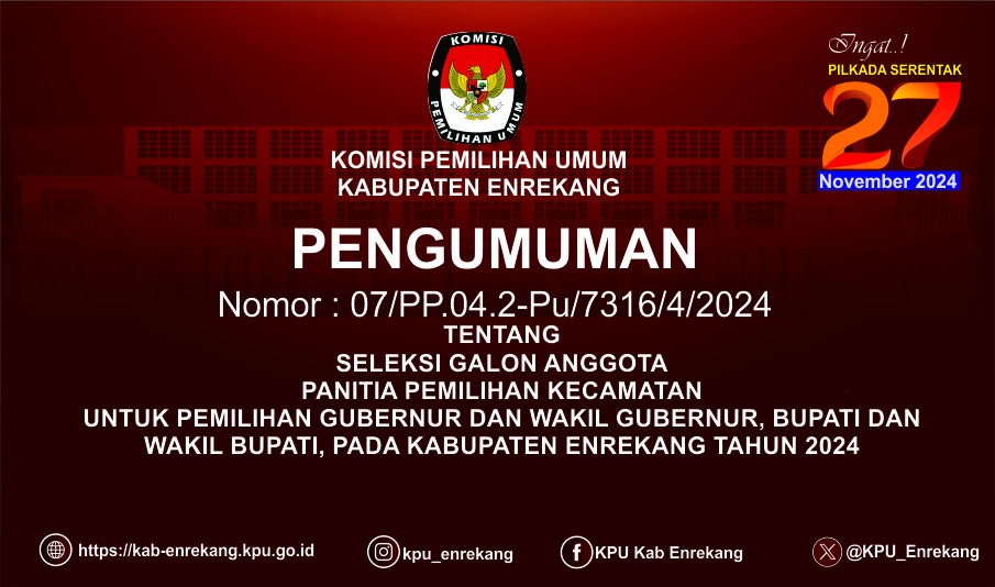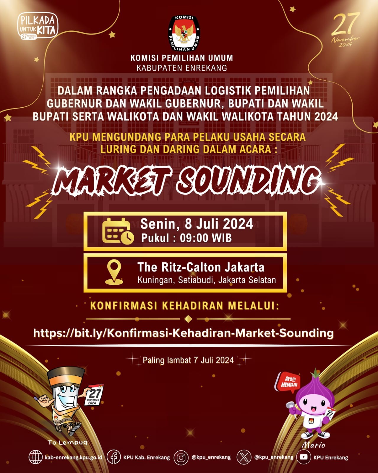Dalam rangka menindaklanjuti Surat Dinas Sekretaris Jenderal KPU Republik Indonesia Nomor : 2334/PP.09.2-SD/06/2024, perihal Pemberitahuan/Pengumuman Pelaksanaan kegiatan Market Sounding dalam rangka Pengadaan Logistik Pemilihan 2024 pada Rapat Koordinasi dan Bimbingan Teknis Persiapan Pengadaan Logistik Pemilihan Gubernur dan Wakil Gubernur, Bupati dan Wakil Bupati, serta Walikota dan Wakil Walikota Tahun 2024.